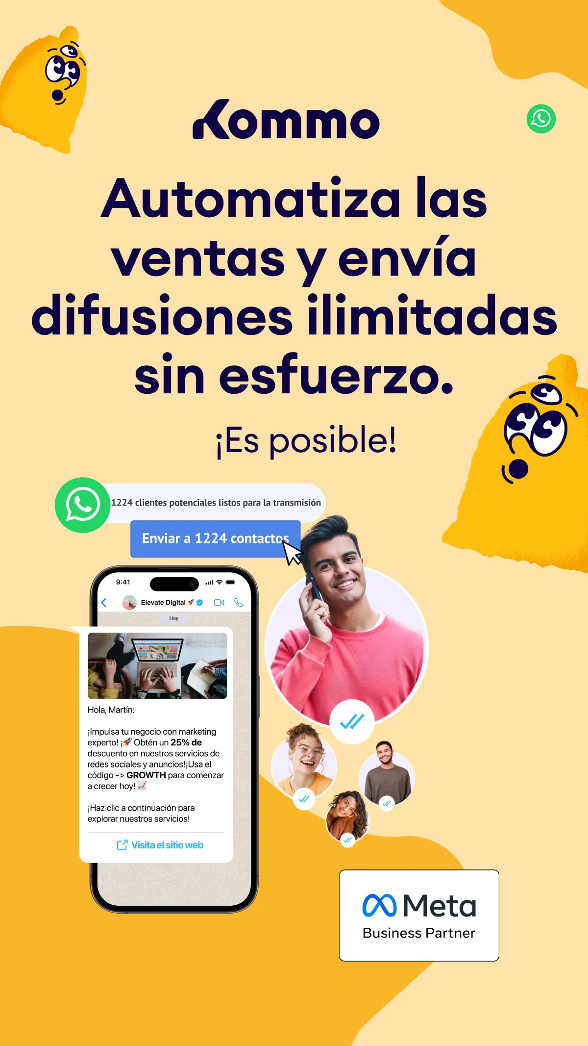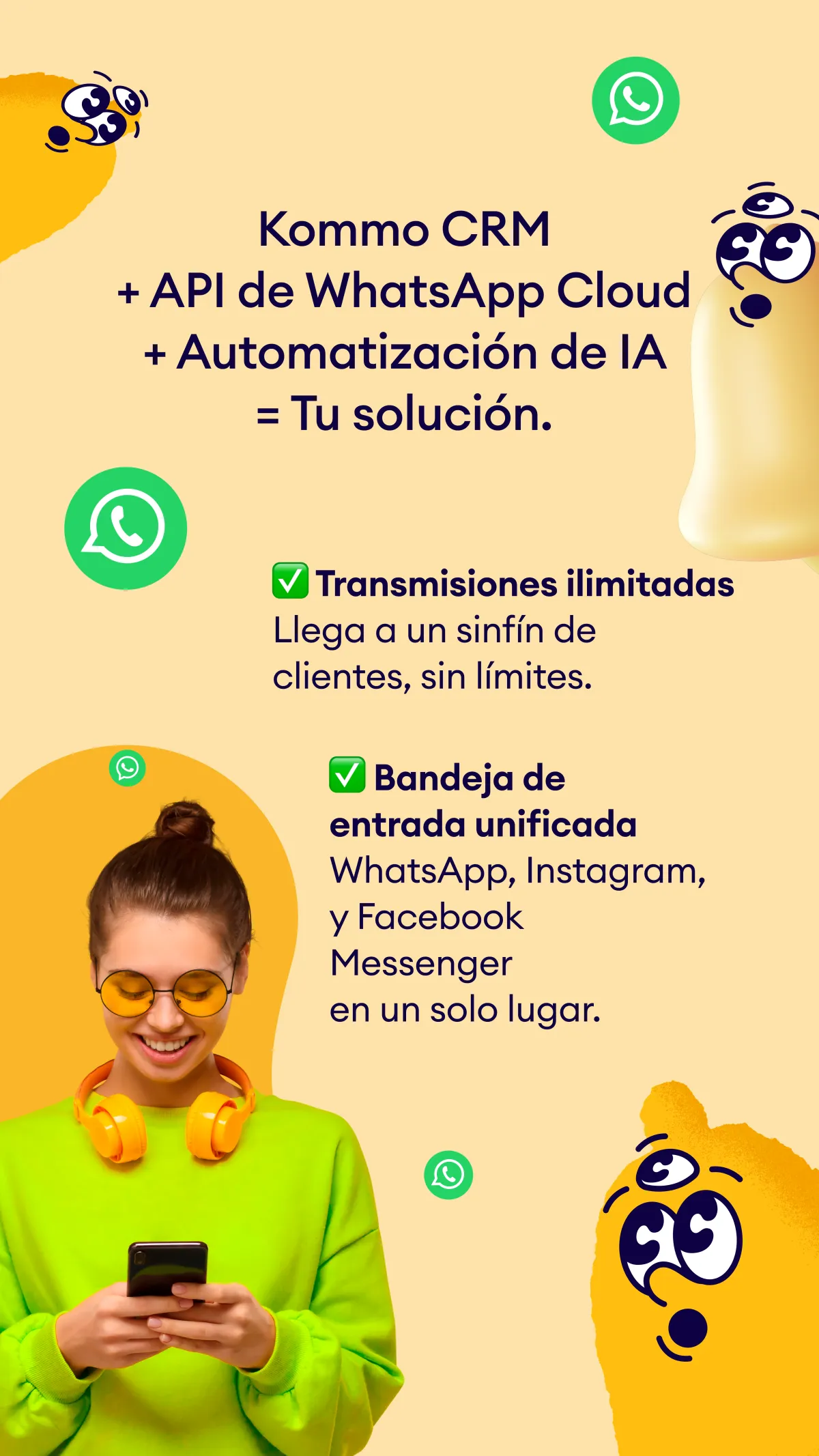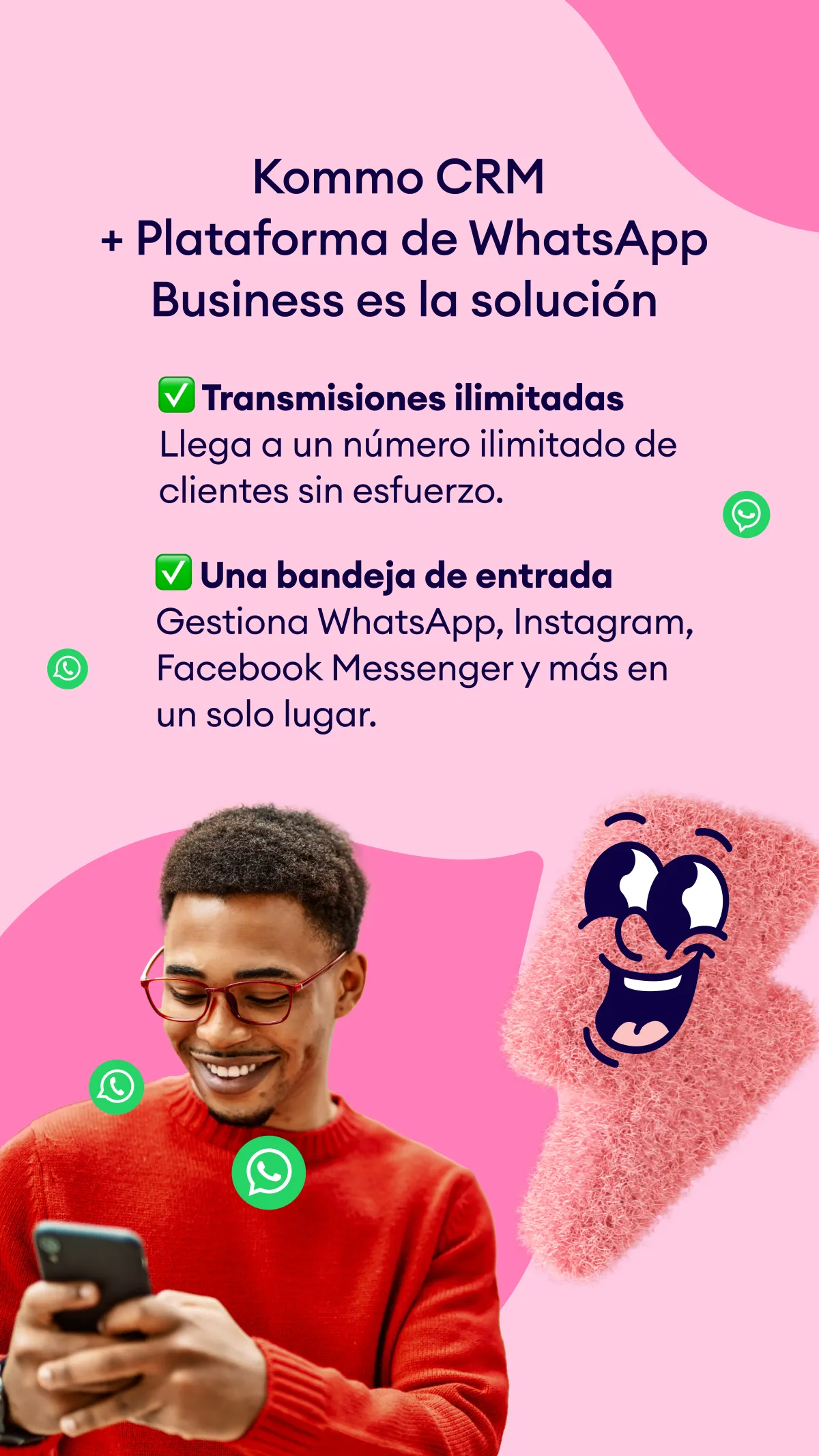 WhatsApp se creó para chatear de forma informal, no para tener conversaciones de ventas importantes. Potencia tu WhatsApp con Kommo, una plataforma desarrollada especialmente para la gestión de todas las etapas de tu proceso de ventas.